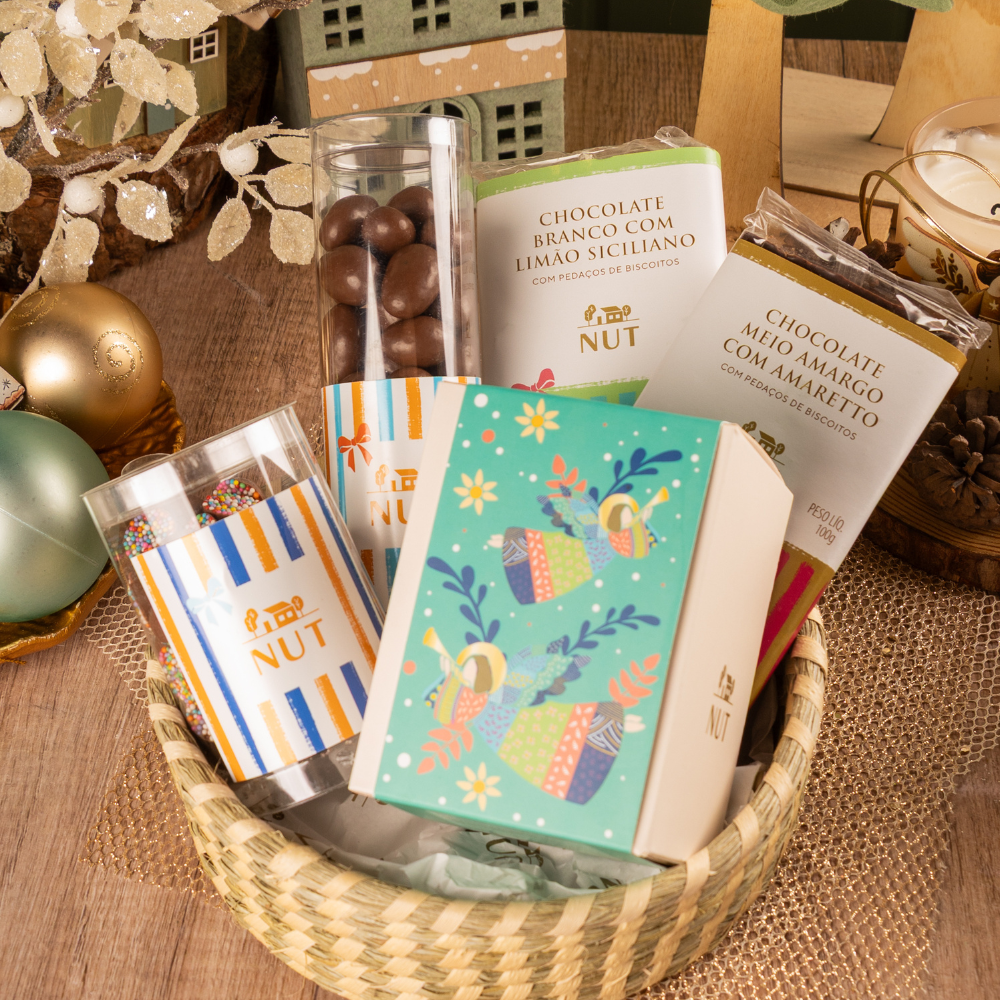 1 Cx Anjo Mini Pão de Mel 1 Choc. NUT com Amaretto 1 Choc. NUT branco com Limão Siciliano 1 Tubo Dragé de Amêndoa 1 Tubo Dragés Coloridos