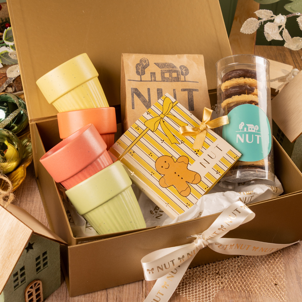 A Caixa Dourada contém: - 4 Xícaras de Café de Cerâmica - 1 Café NUT moído - 1 Boneco Gingerman - 1 Tubo Biscoito de Laranja com Chocolate