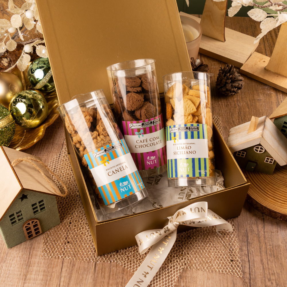 Um kit muito charmoso com 3 tubos dos nossos biscoitos amanteigados preferidos: Canela Café com Chocolate Limão Siciliano.